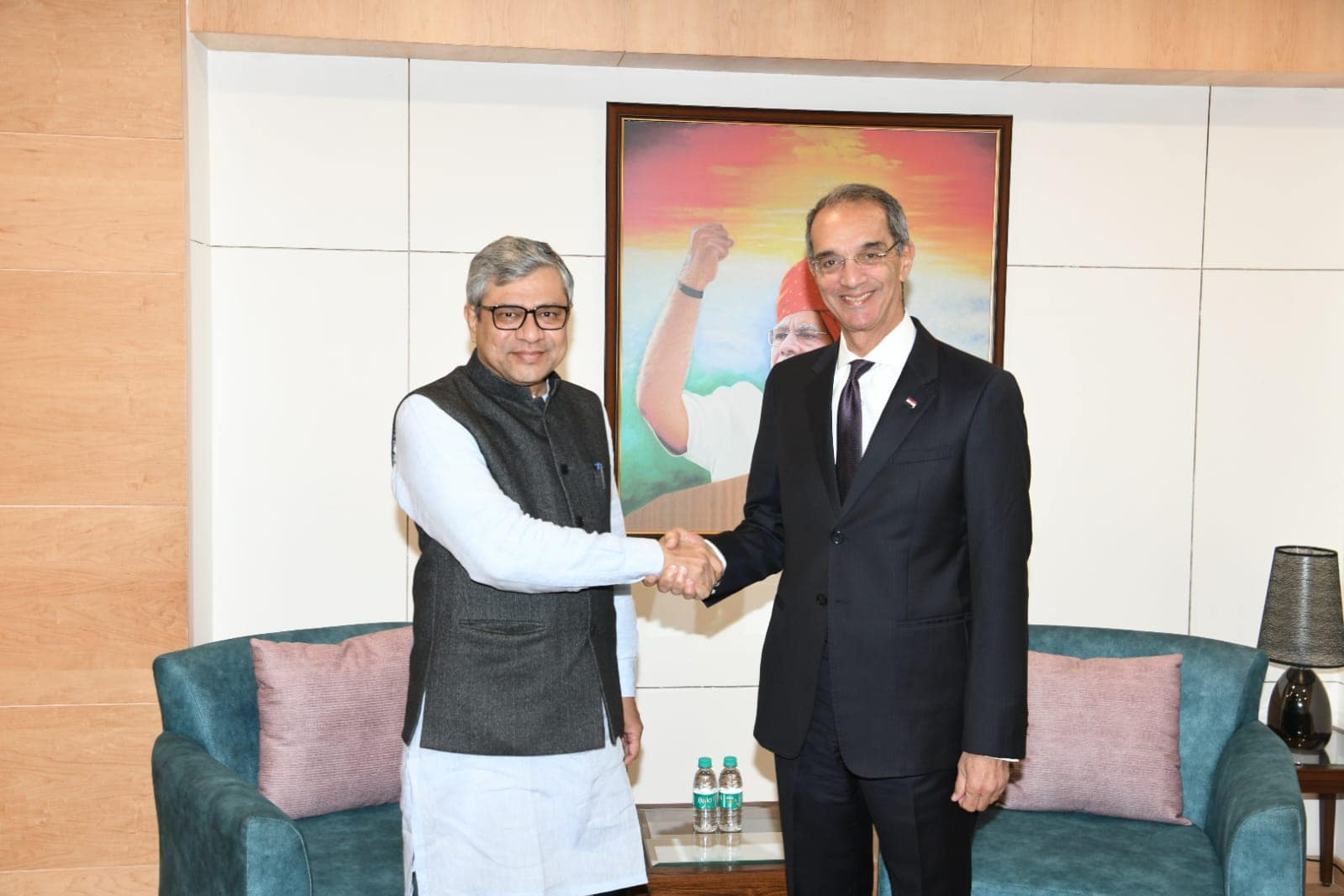 التقى اليوم الدكتور/ عمرو طلعت وزير الاتصالات وتكنولوجيا المعلومات مع السيد/ شرى أشوينى فايشناو الوزير الفيدرالي للسكك الحديدية والاتصالات والإلكترونيات وتكنولوجيا المعلومات الهندى فى العاصمة الهندية نيودلهى بحضور السيد/ وائل حامد سفير مصر فى الهند؛ حيث تناول اللقاء بحث التعاون بين مصر والهند فى عدد من مجالات الاتصالات وتكنولوجيا المعلومات لاسيما المتعلقة بمجالات التحول الرقمى، والبنية المعلوماتية الدولية، وتنمية المهارات فى علوم الاتصالات وتكنولوجيا المعلومات.
