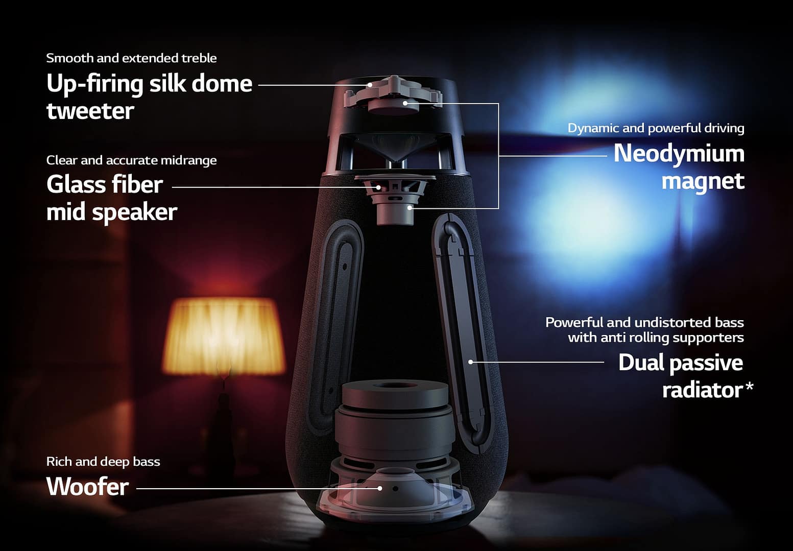 الجسم الخارجي لمكبر الصوت XBOOM 360 المحمول الخاص بالشركة مغطى بالقماش، مما يعطي ملمسًا وشكلًا جماليًا يتناسب مع أثاث المنزل بالإضافة إلى إضاءة LED بأوضاع مختلفة (Party / Healing / Ambient) لتزويد العملاء بشخصية خاصة عند الاستماع. يسهل حمل جهاز XBOOM 360 من إل جي والتنقل في أرجاء المنزل لأنه أيضًا مقاوم للماء والأتربة مما يمنحه مستوى من الحماية من الغبار بالإضافة إلى جعله مقاومًا تمامًا لرذاذ الماء. يحتوي مكبر الصوت على بطارية داخلية تتيح تشغيلًا متواصلًا لمدة تصل إلى 24 ساعة ، مع أعلى تقنية توزيع صوت 360.